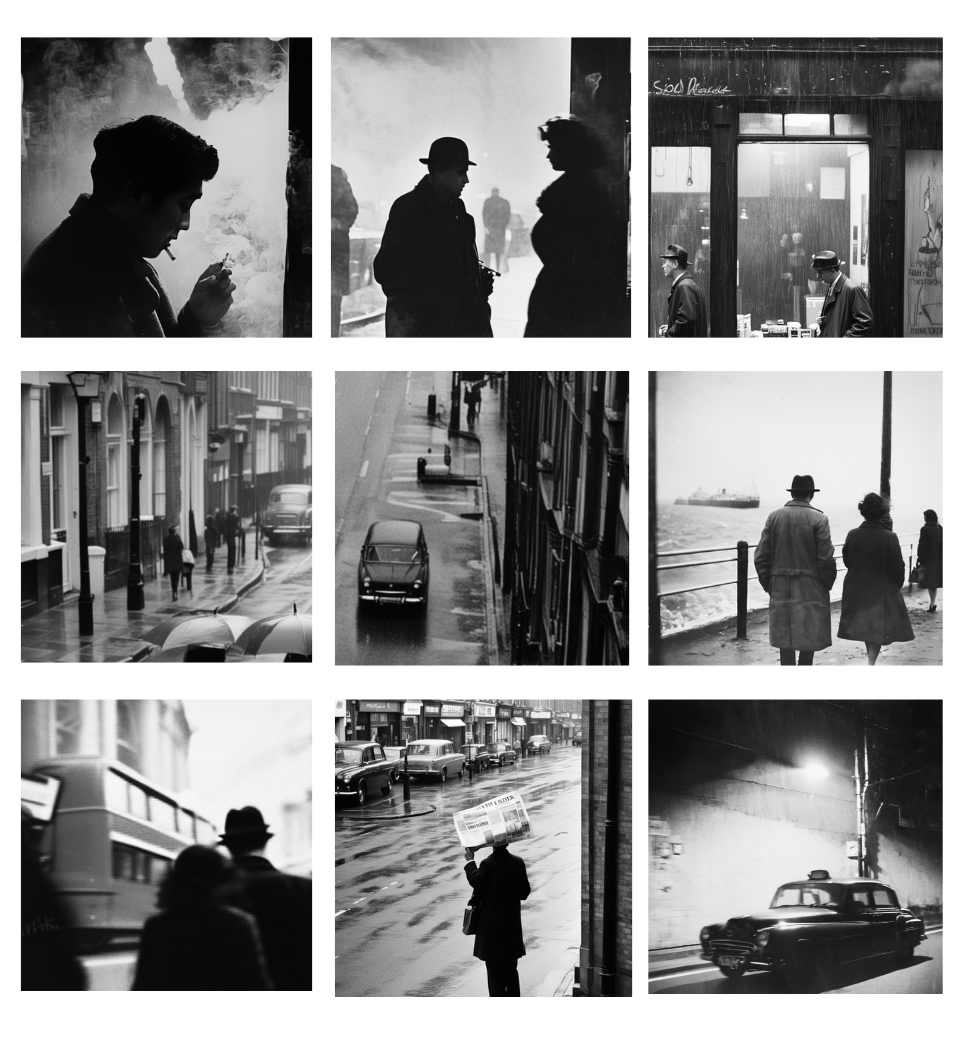 'L' is a collection of black-and-white photographs displayed alongside a real-time radio installation, exploring the intricate relationship between image memory, identity, and artificial intelligence. Inspired by anonymous film negatives discovered at a flea market, the project combines real-life street scenes with generative AI to create a fictional photographer's body of work.